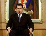 O presidente Hugo Chávez da Venezuela sentado em frente a uma pintura de Simón Bolívar. 3 de dezembro de 2008. |