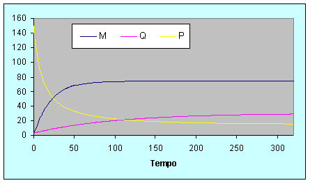 Quando o programa é executado, os produtos se acumulam e nivelam-se, o preço desce, o dinheiro sobe e nivela-se. O pequeno retângulo no tanque Q e sua linha até a caixa do preço indica um sensor que está registrando o valor de Q, porém não o utiliza.