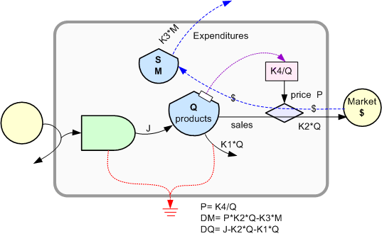 Não importa quantos produtos acumulem, o ganho de dinheiro do negócio permanece o mesmo. Os preços variam para o cunsumidor mas a renda do produtor se mantém constante. O dinheiro recebido é guardado em uma conta bancária (M), e então pago em proporção ao valor na conta (K3*M).
