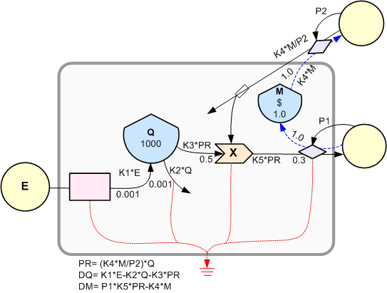 TANKSALE é um modelo de minerar e usar de uma fonte não-renovável (Q), como carvão, petróleo ou cobre. O dinheiro recebido pelo produto é usado para pagar por entradas necessárias, lucros, custos, etc. A empresa de mineração usa bens e serviços adquiridos (F) para minerar, ordenar, guardar e transportar o produto. A reserva no solo (Q) é lentamente renovada pelo processos geológicos (K1*E). Já que o uso é maior que a renovação, nós chamamos de recurso "não-renovável".