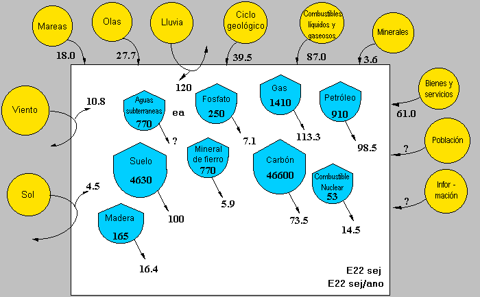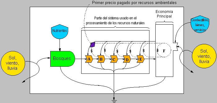 Observe que la energía de todo el proceso incluye (en la izquierda) las energías renovables como sol, viento y lluvia, la energía almacenada en los nutrientes, y que los recursos renovables y no renovables (en la derecha) son los que manejan la economía principal. El trabajo de la naturaleza para el crecimiento de la madera es dirigido por los recursos renovables y no renovables, y esas energías contribuyen al sistema económico del cual la madera hace parte.