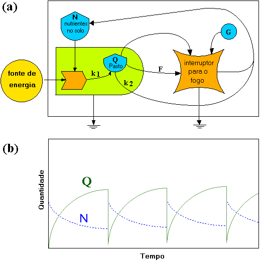 Isto significa que quando o pasto (Q) cresce sobre o limite (G), o fogo se inicia. O pasto se queima até um nível baixo de biomassa (Q - F). Depois disto começa a crescer novamente.