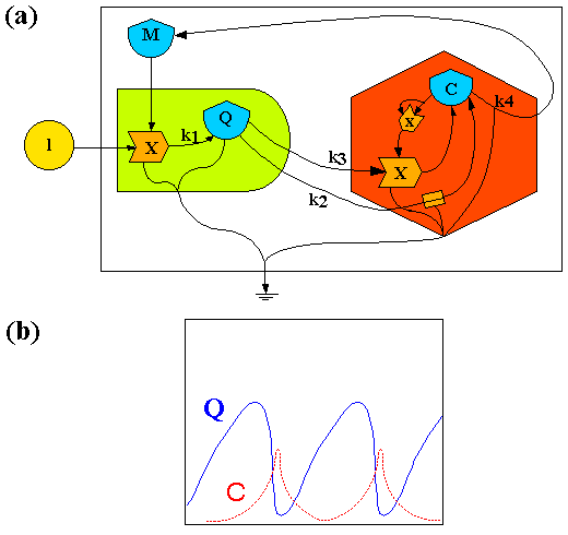 Um modelo similar explica a oscilação das reações químicas que geram belos desenhos em soluções de um laboratório de química. As oscilações no tempo possuem formas espaciais. Existe um interesse mundial na idéia de que, mediante este tipo de sistema, as reações químicas desenvolvem estruturas vivas.