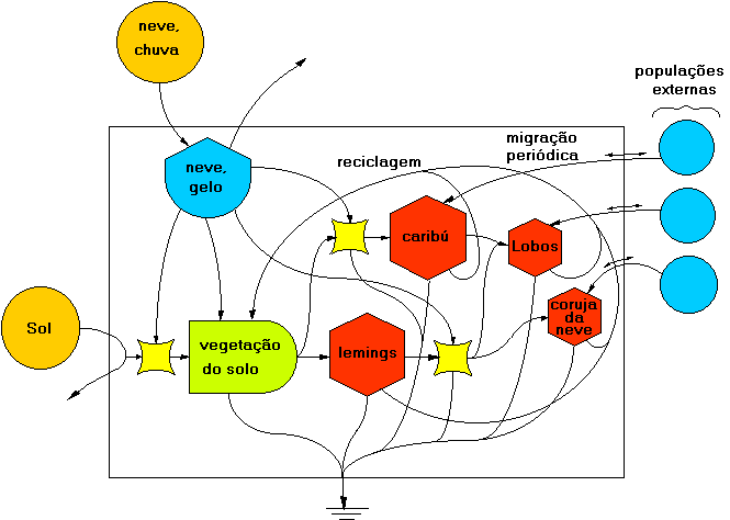 Este ecossistema mostra as oscilações discutidas no Capítulo 9. A medida que a vegetação aumenta, o número de lemings aumenta e o número de seus consumidores também aumenta. Então, a medida que sua fonte de alimento se reduz a população de lemings decresce rapidamente. Como os carnívoros tornam-se abundantes, os lemings são comidos também rapidamente. Com menos lemings, o alimento disponível para cada um deles é maior, e a população começa a incrementar-se novamente. Este ciclo em particular, toma sete a dez anos.