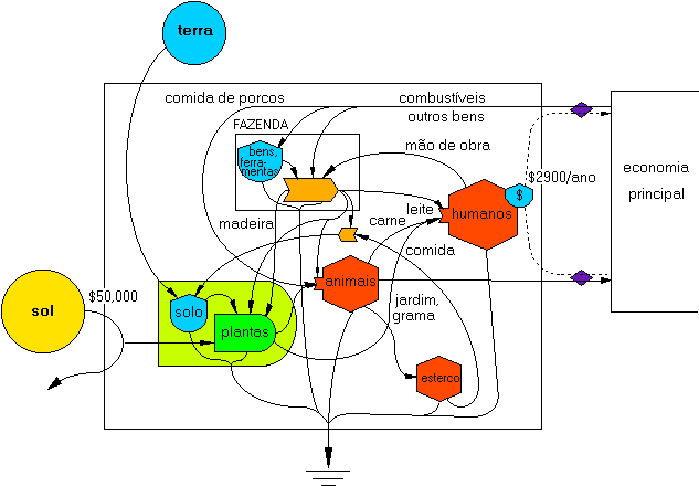A Figura 18.3 é um modelo de agroecossistema familiar que é mais auto-suficiente que o sistema de pastoreio de gado (Figura 18.1). A fazenda mostrada no diagrama recebeu um prêmio pelo alto grau de auto suficiência, comparável à fazenda dos colonizadores pioneiros. Todavia, ela necessita de uma grande aplicação de energia e bens da economia principal. A economia de sobrevivência na sociedade atual provavelmente requer que se realizem algumas compras externas.