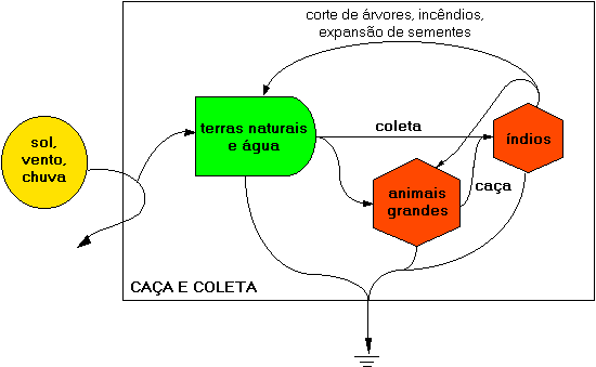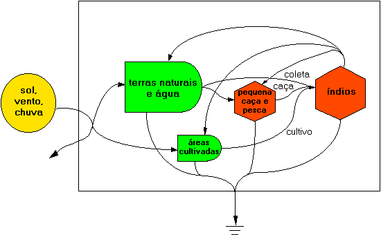 O diagrama na Figura 21.1 mostra a relação desses indígenas primitivos com seu meio ambiente. A economia se baseava na energia solar, cultivando plantas e sustentando a cadeia alimentar em animais dos quais os índios dependiam. Sua economia era uma economia de energia solar, e não podia manter uma grande população. Os índios primitivos ocupavam o topo desta cadeia alimentar. Como se viu na rede alimentar da floresta (Capítulo 3) e a transformação de energia nos trópicos (Capítulo 4), o papel do consumidor final, que se apoia em cadeias alimentares baseadas na energia solar, é limitada pela produtividade do meio.