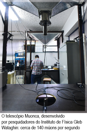 No subsolo do Instituto de Física Gleb Wataghin (IFGW) da Unicamp, quatro pirâmides metálicas – dispostas como um par de ampulhetas, ocupando todo pé-direito da sala, onde se encontram também bancadas e computadores – coletam múons, partículas invisíveis geradas por raios cósmicos e que passam através das lajes de concreto do prédio e dos corpos humanos sem se fazer notar. “Em um metro quadrado, a cada segundo, passam mais ou menos 140 múons”, explica o pesquisador Anderson Fauth, responsável pelas “ampulhetas” que formam o telescópio Muonca [acrônimo para Múons em Campinas].