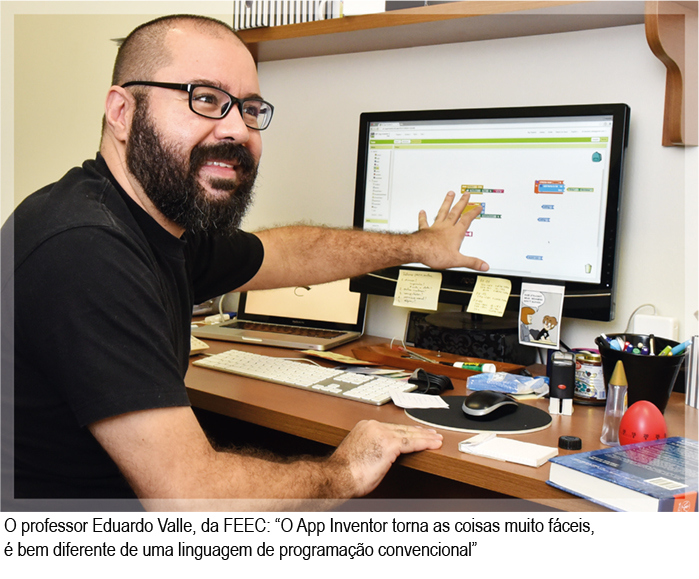 O professor e pesquisador Eduardo Valle da Faculdade de Engenharia Elétrica e de Computação (FEEC) da Unicamp, atual coordenador de graduação do curso de Engenharia da Computação, completou, no início do ano, a tradução para o português da ferramenta de criação de aplicativos para celulares MIT App Inventor, disponibilizada gratuitamente na internet pelo Massachusetts Institute of Technology (MIT). Por meio do App Inventor, pessoas sem experiência em programação podem criar aplicativos para celulares da plataforma Android. Essa versão traduzida já está online, no site oficial https://appinventor.mit.edu/explore/.