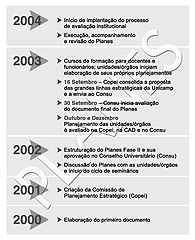 Tadeu O processo se inicia com a elaboração do documento-base que define a visão de futuro. Temos uma primeira versão desse documento, gerada em 2000, mas inacabada. Essa primeira versão está servindo como uma minuta para que todas as unidades critiquem. Ao final de setembro, o Consu estará analisando esse documento-base, que definirá a missão, os objetivos, valores e ações estratégicas para a universidade. Nesse momento, estamos recebendo das unidades e órgãos sugestões e críticas para a formulação desse documento inicial. Nesse processo, a Copei examinará as críticas e sugestões visando à redação do documento base. Numa reunião agendada para o dia 16 de setembro, a Copei finalizará o texto que irá para o Consu.