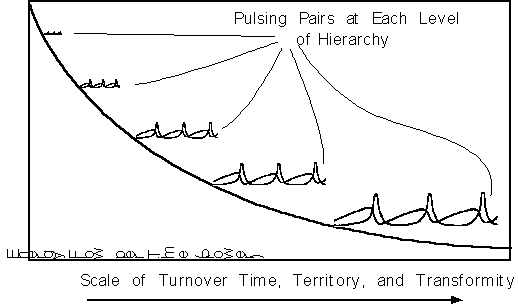 Apparently, all systems on all scales pulse (Figure 6). Gradual accumulation of one storage is followed by a short period of frenzied consumer use and development which disperses materials, setting up the next growth period. Pulses cause oscillations in emergy, empower, and transformity. Inputs from pulses on smaller scale than the window of interest look like noise and can be averaged as if there was a steady state. The infrequent pulses from the larger scale than the window of interest are catastrophic with high transformity and effect (hurricanes, earthquakes, economic pulses, information storms, etc.).