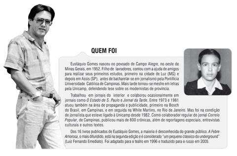 Eustáquio Gomes teve 16 livros publicados, contribuiu com mais de 800 crônicas no jornal campineiro Correio Popular e, ocasionalmente, escreveu também para O Estado de S. Paulo e Jornal da Tarde. “As pessoas pensam que é fácil escrever”, ele comentava com o amigo Roberto Goto. “Era em menção a todo o trabalho que a escrita de um romance exige, trabalho muitas vezes interrompido por questões relativas ao progresso do enredo, à construção de personagens, à adoção do tom adequado etc.”, acrescenta o professor da Faculdade de Educação.