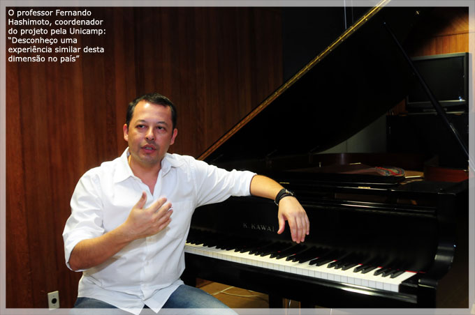 O professor Fernando Hashimoto, coordenador do projeto pela Unicamp, tem a colaboração de três colegas do Departamento de Música, Leandro Barsalini, Adriana Mendes e Paulo Ronqui; de três licenciados pelo IA atuando na supervisão geral; e de mais 27 alunos estagiários que se encarregarão das aulas. Inicialmente são 622 vagas: 320 de musicalização para crianças entre 6 e 10 anos, e 302 para aulas com instrumentos, na faixa de 11 a 14 anos. “É uma oportunidade única, a primeira vez que levamos um projeto de ensino musical deste porte para uma escola da rede de Campinas”, afirma Hashimoto.