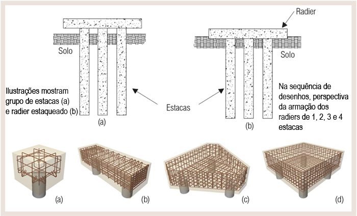 Quando se considera a contribuição de um elemento superficial de fundação – sapata ou bloco – na capacidade de carga, simultaneamente com as estacas, tem-se o que se denomina radier estaqueado. Nestes casos, o radier apoiado sobre o solo recebe o suporte tanto das estacas como do terreno. A diferença entre o radier estaqueado e os grupos convencionais de estacas é que, neste, o coroamento não está em contado com o solo, conforme mostram as figuras nesta página.