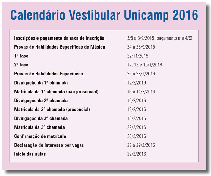 A Comissão Permanente para os Vestibulares da Unicamp (Comvest) recebeu um número recorde de inscrições para o Vestibular Unicamp 2016: 77.760 inscritos. É o sétimo ano consecutivo que a Unicamp registra crescimento do número de candidatos. Nos dois últimos processos (2014 e 2015), o Vestibular Unicamp teve 73.818 e 77.146 inscritos, respectivamente. O aumento em relação ao ano anterior é de 0,8%. No Vestibular Unicamp 2016, os candidatos disputarão 3.320 vagas distribuídas em 70 cursos de graduação da Unicamp. A relação de candidatos por vaga (c/v) praticamente se manteve: de 23,2 no vestibular passado para 23,4 nesta edição. A tabela completa está na página eletrônica da Comvest, assim como o total de inscritos por cidade de prova. Os locais de prova da primeira fase serão divulgados pela Comvest no dia 31 de outubro, também em sua página na internet. A primeira fase será realizada no dia 22 de novembro e a segunda fase acontecerá nos dias 17, 18 e 19 de janeiro de 2016. Antes da primeira fase, haverá provas de Habilidades Específicas para candidatos aos cursos de Música, no período de 24 a 28 de setembro. Para os demais cursos (Arquitetura e Urbanismo, Artes Cênicas, Artes Visuais e Dança), as provas de Habilidades Específicas ocorrerão no período de 25 a 28 de janeiro de 2016.